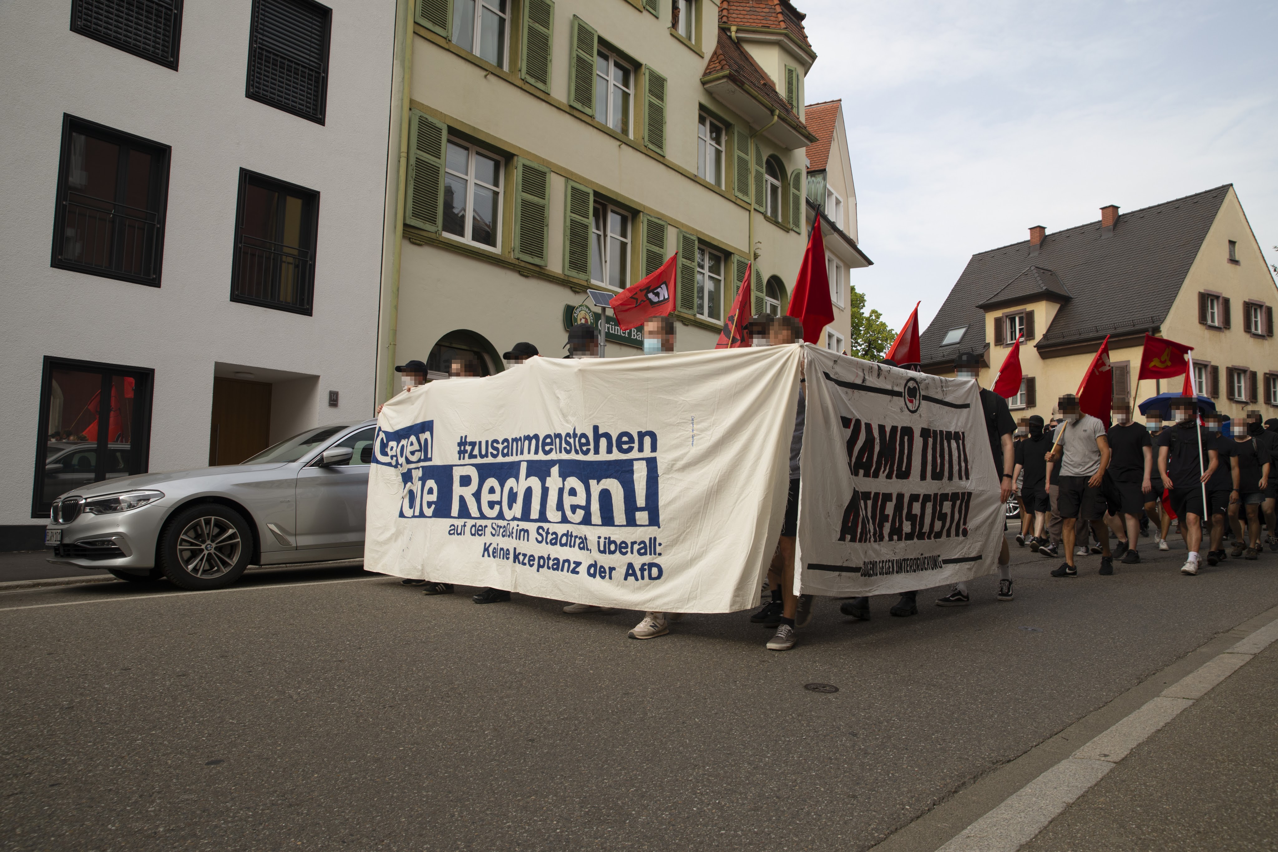 Der Demonstrationszug setzte sich laut und flotten Tempos in Bewegung und lief durch die Wiehre. Am Tatort angelangt, wo Robert Hagerman (AfD) eine Woche zuvor mehrere Menschen mit Pfefferspray verletzt und eine Person mit einem Messer niedergestochen hatte, wurde ein Redebeitrag verlesen. Dieser thematisierte diesen Angriff, und stellte ihn in den Kontext Hagermans Aktivismus in der lokalen verschwörungsideologischen ‚Querdenken‘-Szene. Außerdem wurde die Polizei kritisiert, die in ihrer Pressemitteilung nur die Sicht des mutmaßlichen Täters wiedergegeben hatte. Auch dass Robert Hagerman am selben Tag in die Freiheit entlassen wurde zeige, wie „erschreckend und inakzeptabel“ mit solchen Taten umgegangen werde. So rufen die Autor:innen der Rede „alle Menschen in Freiburg und darüber hinaus dazu auf, sich zusammenzutun, sich zu organisieren und gemeinsam aktiv zu werden, um gegen faschistische Parteien wie die AfD und rechte Bewegungen wie Querdenken Widerstand zu leisten!“