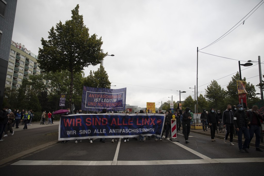 Der mittlerweile auf mehrere Tausend Teilnehmende angewachsene Demonstrationszug setzte sich nach der Aufstellung laut und mit viel Pyro in Bewegung. Die Demonstration deckte ein breites Bündnis antifaschistischer Zusammenhänge ab. Vorne weg lief der „Wir sind alle LinX“- Bündnisblock, gefolgt von dem Lautsprecherwagen. Dahinter reihten sich die Menschen in den Internationalistischen Block, der sich gegen die Kriminalisierung der HDP aussprach, in den Block der NIKA-Kampagne oder in den Revolutionären Block ein. Letztgenannter nahm mit eigenem Lautsprecherwagen an dem Aufzug teil. In den Durchsagen und Ansprachen, die daraus erklangen sprachen sich die Redenden gegen Kapitalismus und für eine antifaschistische Organisierung aus, die von der Reaktion in die Aktion wechseln solle, denn nur so würde man eine „starke Gegenmacht“ zum erstarkenden Faschismus bilden. Im Nachgang zur Demonstration wurde von mehreren Teilnehmenden kritisiert, dass sich in den Reihen des revolutionären Blocks ehemalige Kader des aufgelösten und antisemitischen „Jugendwiderstands“ befunden haben sollen.