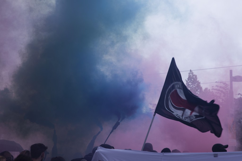 Inhaltli in der letzten Hälfte, beziehungsweise dem letzten Drittel der Demonstration, hatte aus dem Lautsprecherwagen des revolutionären Blocks eine Rede von acht Antifa-Gruppen aus Süddeutschland gehallt. Wie zuvor die Anarchist*innen plädieren auch diese Gruppen für eine Organisierung einer starken antifaschistischen Bewegung. Doch anders, als bei jener, scheinen sich diese Gruppen nicht dem föderalistischen, sondern einer kollektivistischen Gesellschaftsstruktur verbunden zu fühlen: „Organisierung, das ist mehr als die Summe der einzelnen Teile. Erst durch Organisierung können wir ein Kollektiv, einen Faktor schaffen, der Theorie und Praxis in ein Verhältnis zueinander setzt.“