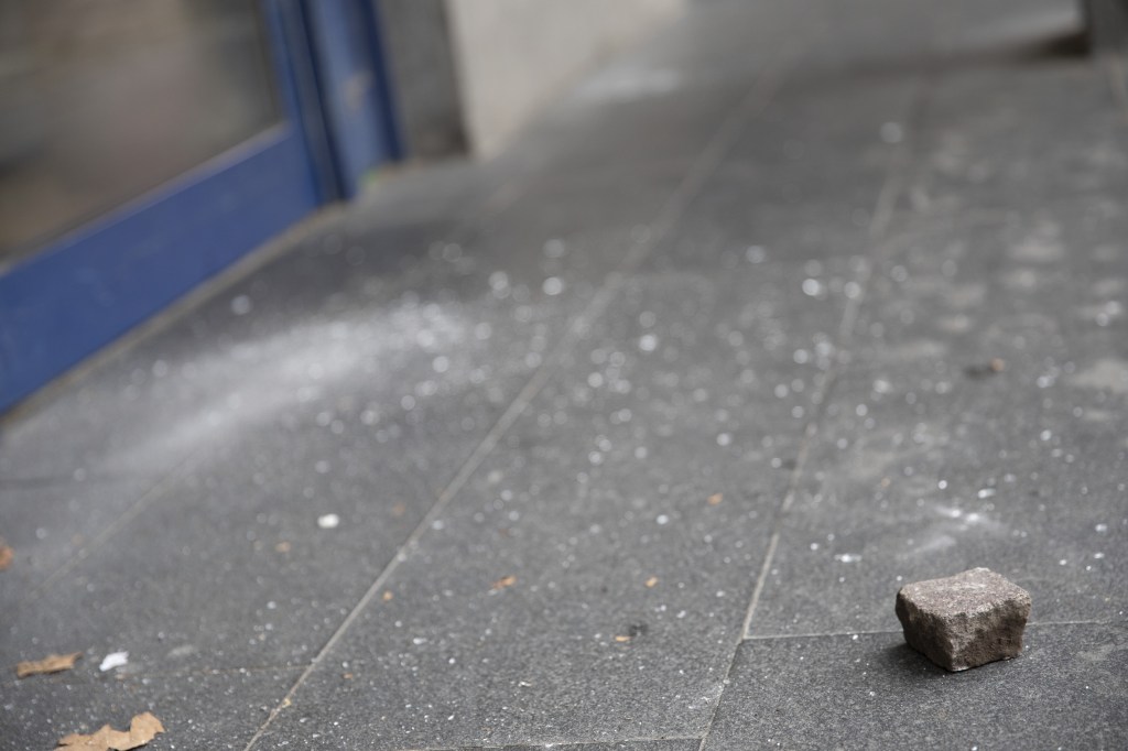 Als die Zwischenkundgebung beendet wurde, setzte sich der Demonstrationszug weiter in Bewegung. Als sich die Mitte des Zuges auf der Höhe der „Dimitroff-Wache“ befand, begannen einige Aktivist*innen das Gebäude mit Pyrotechnik und Flaschen anzugreifen und in der Nähe befindende Polizeieinheiten ebenfalls. Die Polizei war zwar mit einem Großaufgebot im Einsatz, verhielt sich vor und nach dieser Situation während der Demonstration defensiv und deeskalierend. Mit Ausnahme eines dauerhaft präsenten Kamerawagens und dem dicht über der Demonstration kreisenden Helikopters. Dieses deeskalative Vorgehen sollte sich im weiteren Verlauf des Abends jedoch noch ändern.