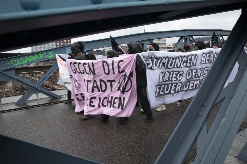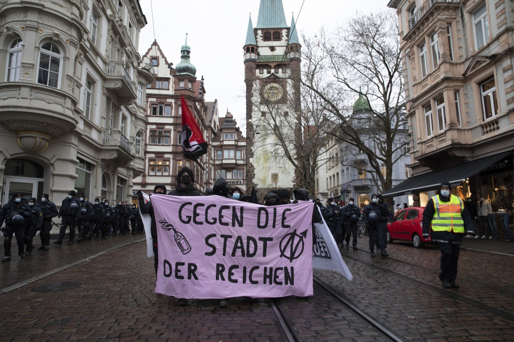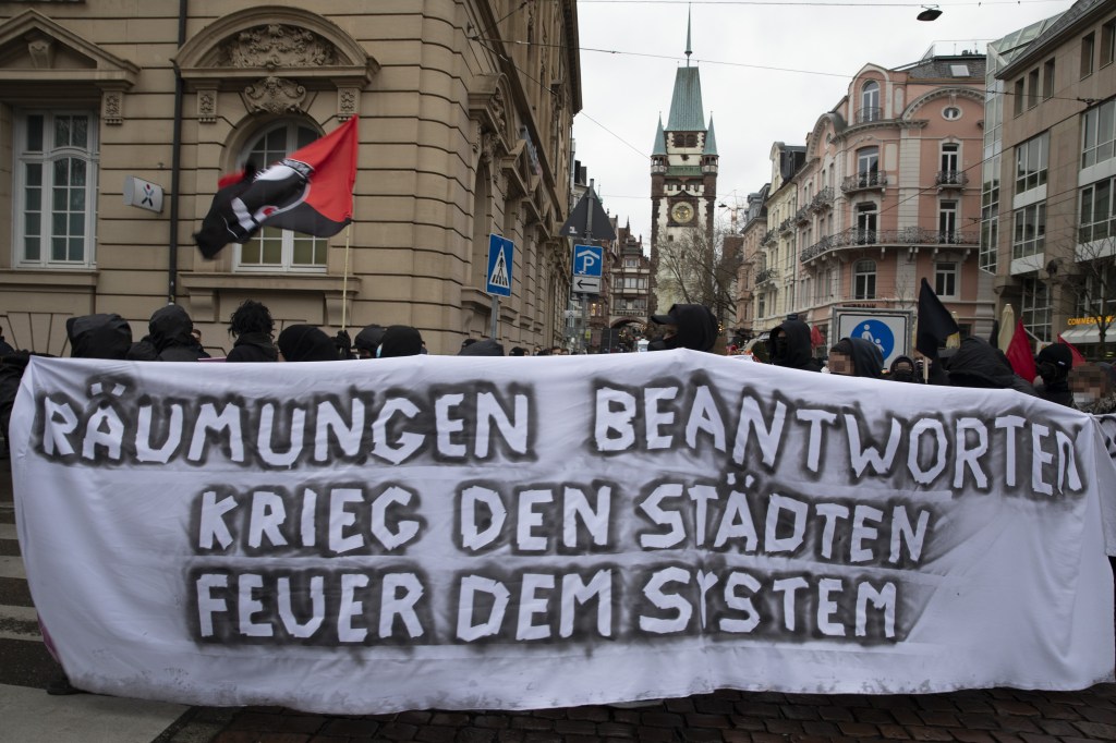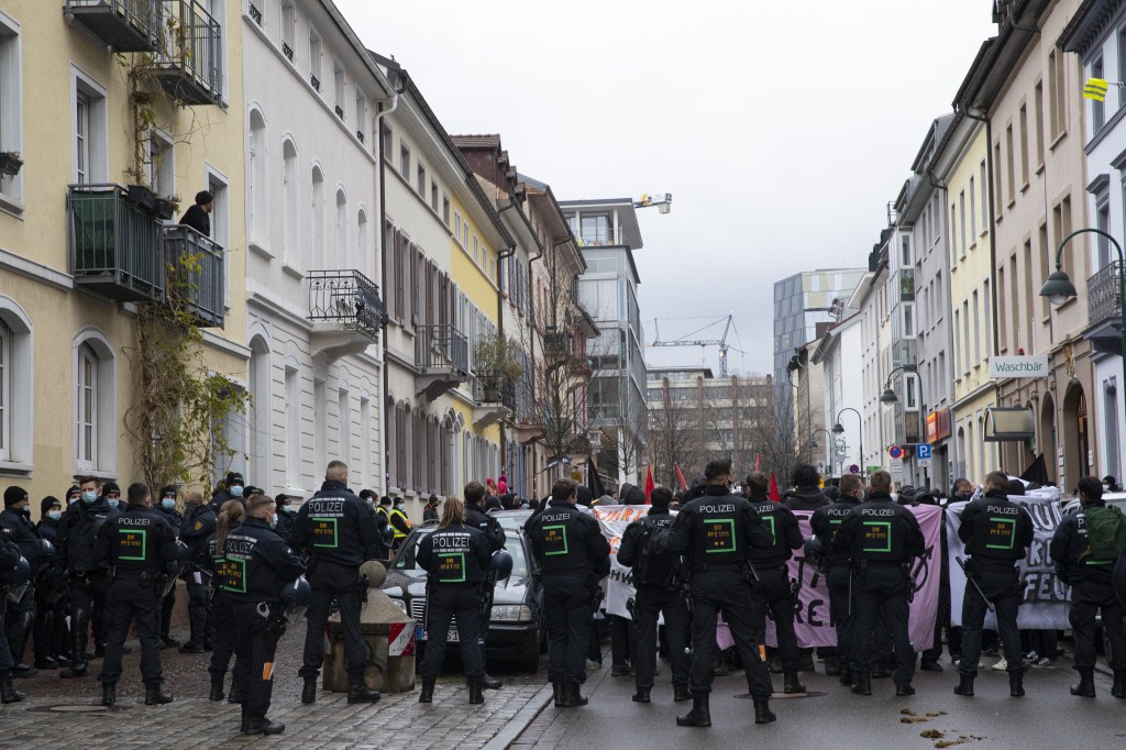 Der Demonstrationszug wurde durch ein massives Polizeiaufgebot begleitet und führte durch die Innenstadt in den Stühlinger.