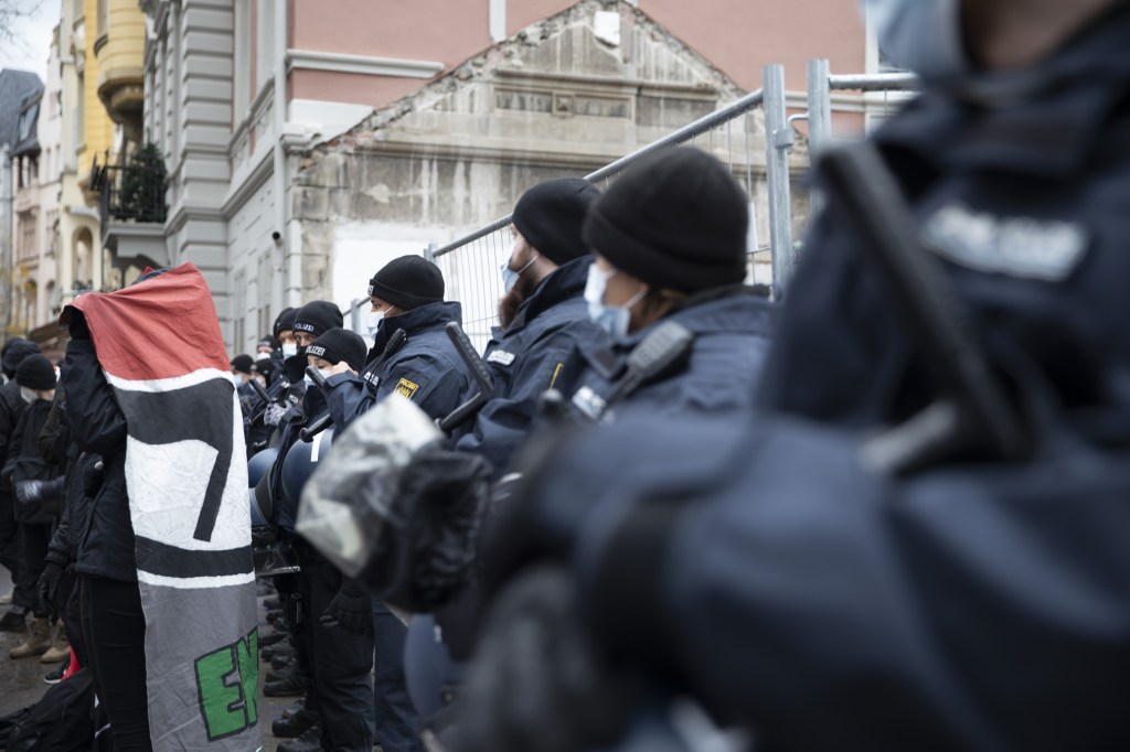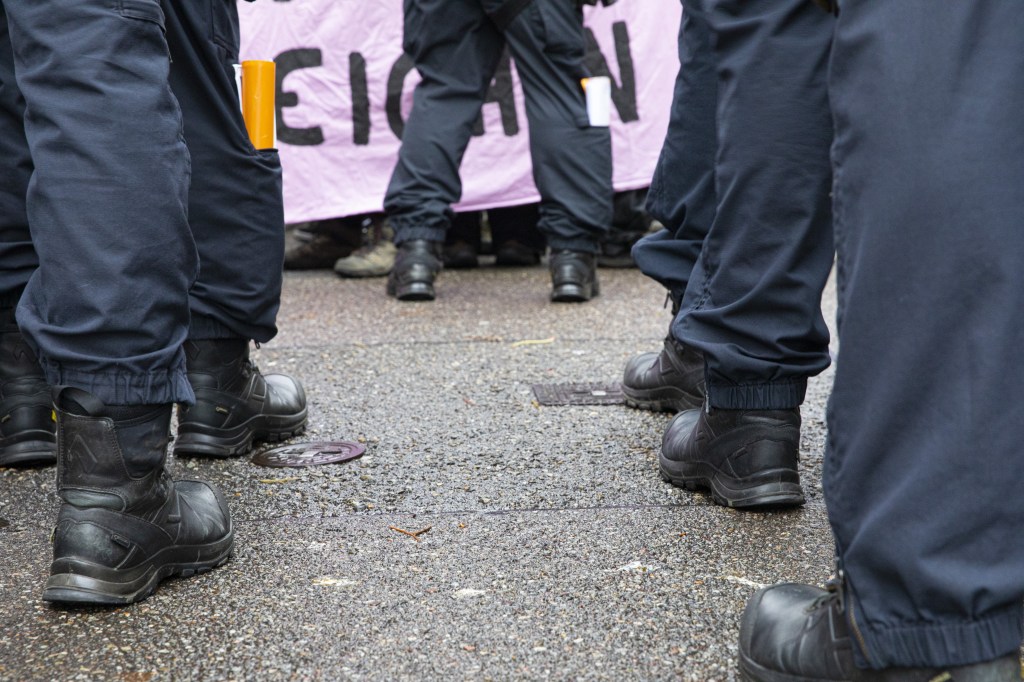Die Polizeieinsatzkräfte begleitete die Demonstration meist im engen Spalier und stoppte sie mehrfach um vermeintliche Absprachen über die Route zu treffen.