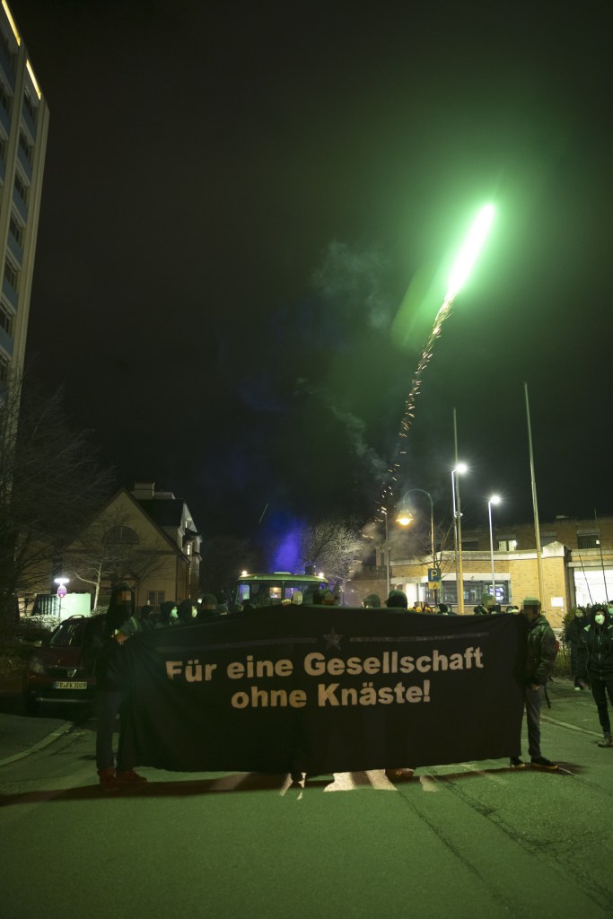 Der Demonstrationszug zog nach einem Redebeitrag zur Knastkritik und den zahlreichen Inhaftierungen von Antifaschist*innen im endenden Jahr 2021 eine Runde um die JVA. Ein befreiender Ansatz soll transformative Gerechtigkeit darstellen, die Gefängnisse unnötig machen würde. Auch dafür würden die Anwesenden weiterhin demonstrieren, so der Redner.