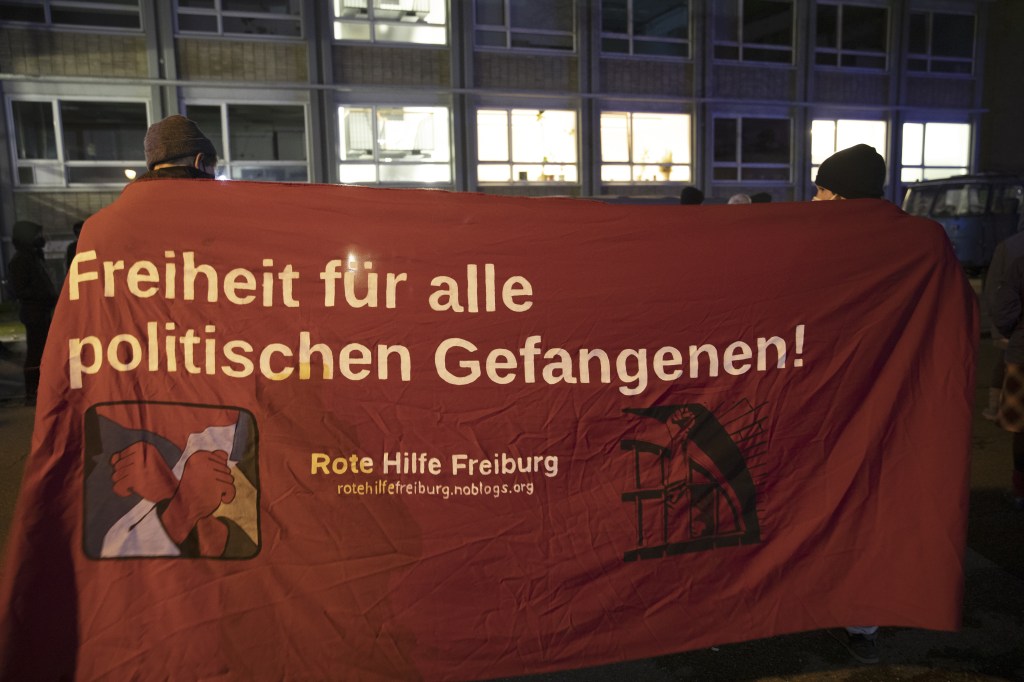 Vor dem Haupteingang der JVA in der Hermann-Herder-Str. startete der Vor dem Haupteingang der JVA in der Hermann-Herder-Str. startete der Demonstrationszug zur Tennenbacher Str., wo eine Zwischenkundgebung mit einer Ansprache von der Roten Hilfe und einem Grußwort von Thomas Meyer-Falk eingelegt wurde. Thomas Meyer-Falk wurde 1996 aufgrund eines missglückten Banküberfalls inhaftiert & kam nach der verbüßten Haftstrafe in Sicherheitsverwahrung, weil ein Schuldeingeständnis fehle. Mit dem Geld aus dem Überfall wollte er eigenen Angaben zufolge linke Projekte unterstützen.