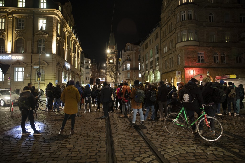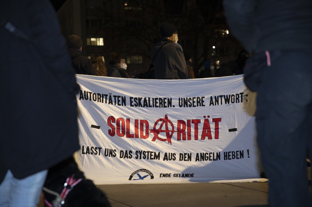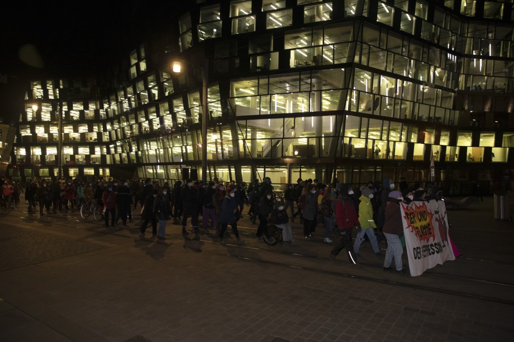 Nach dem Urteil gegen zwei Baumbesetzer*innen wegen Widerstands gegen Vollstreckungsbeamt*innen zu 60 Tagessätzen demonstrierten in den frühen Abendstunden des 25.1.22 rund 100-200 Menschen in Freiburg, als Zeichen der Solidarität mit den Verurteilten der Klimagerechtigkeitsbewegung.
