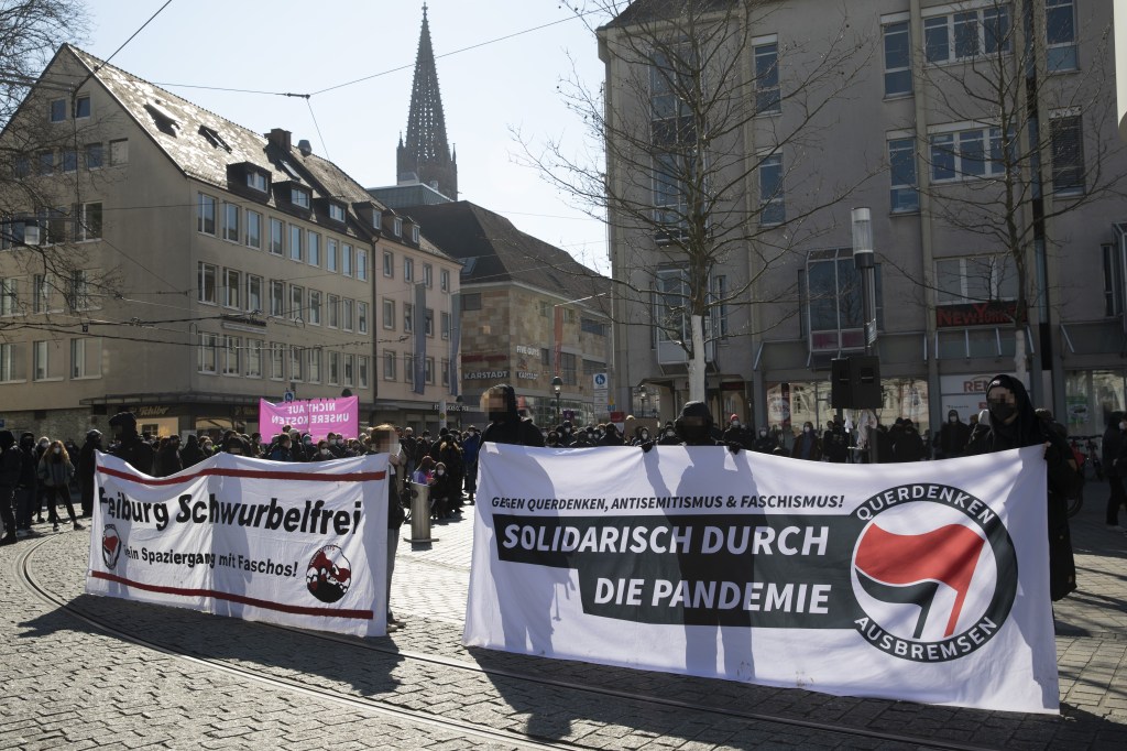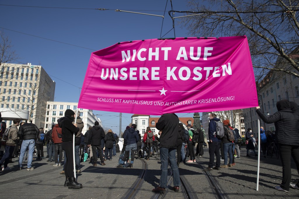 Auf einer Kundgebung unter dem Motto „Nicht auf unsere Kosten – Schluss mit Kapitalismus und autoritärer Krisenlösung“ fanden sich etwa 150 Personen zusammen, um eine solidarische Maßnahmenkritik zu üben.