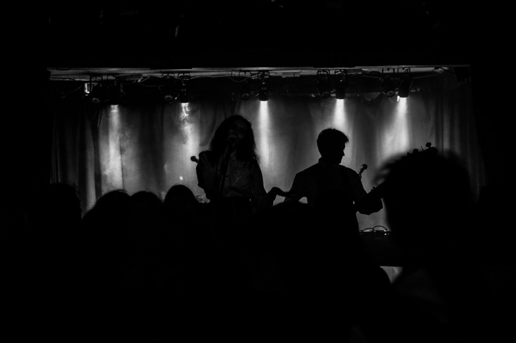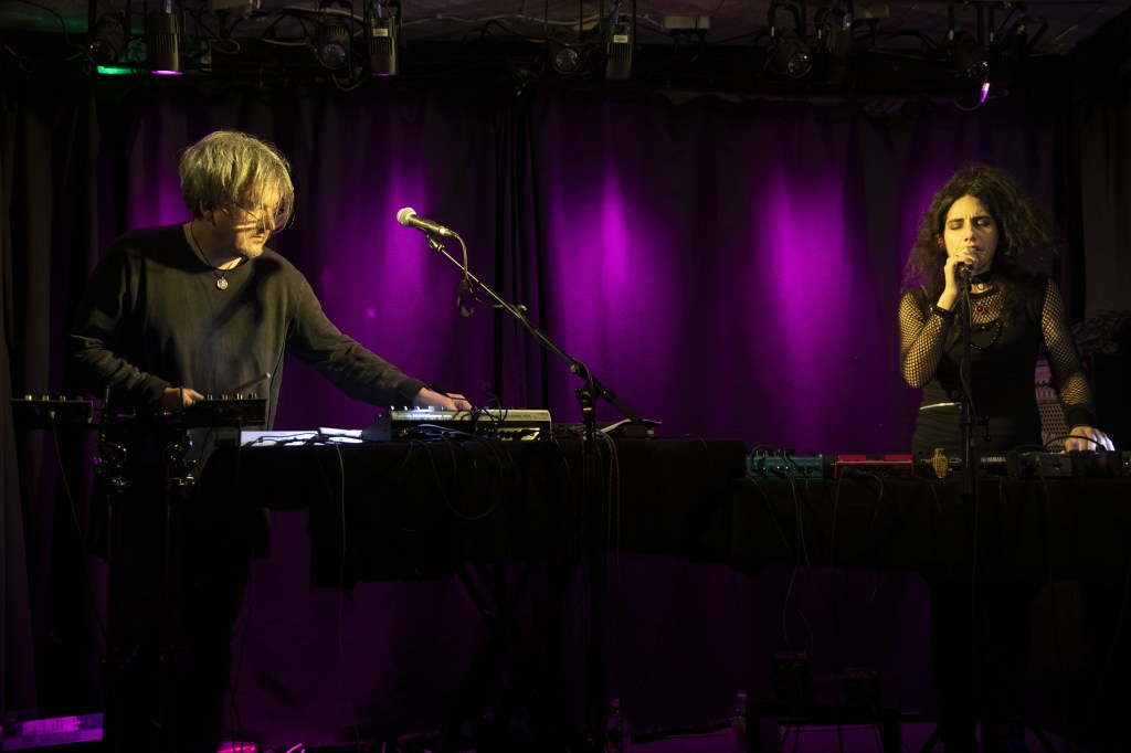 Die dutzende Menschen warten vor der Bühne ungeduldig auf den Beginn der Show. Eine betrübte Synthiemelodie erklingt, dann betreten die zwei ersten Künsler*innen die Bühne und der Vorhang lüftet sich. Es ist das Coldwave-Duo The Glass Beads. Der viktorianisch anmutende Stil, die adrette Kleidung passt zur sanft melancholisch Musik der beiden aus der Ukraine stammenden Musiker*innen. Der Gesang bleibt tief, der live gespielte Bass monoton. Die Menge im Club schwebt rund 50 Minuten wie in Trance über’s Parkett.